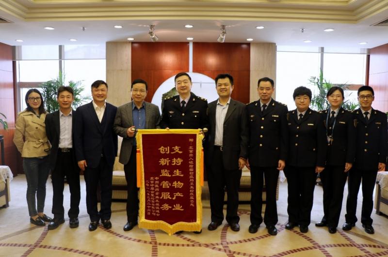 2018年3月28日,中國醫(yī)藥企業(yè)發(fā)展促進(jìn)會(huì)(以下簡稱“促進(jìn)會(huì)”) 副會(huì)長姚桐利和中原公司總裁朱曉勇、副總裁李志剛一起,向北京出入境檢驗(yàn)檢疫局(以下簡稱“北京國檢局”)衛(wèi)生監(jiān)督處贈(zèng)送了錦旗,為其多年來對我國生物醫(yī)藥產(chǎn)業(yè)的大力支持,不斷創(chuàng)新監(jiān)管服務(wù)表示感謝。北京國檢局副局長邵白、衛(wèi)生處處長黃健華代表北京國檢局表示感謝并進(jìn)行了親切座談。