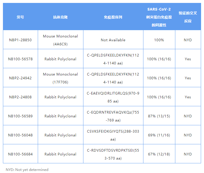 SARS-CoV-2 的表面糖蛋白或刺突蛋白與 SARS-CoV 的刺突蛋白具有 76% 的序列同源性。Novus Biologicals? 提供了幾種用于檢測(cè) SARS-CoV 刺突蛋白的抗體,這些抗體可用于 WB、ICC / IF、ELISA 等多種應(yīng)用。根據(jù)Novus 的創(chuàng)新計(jì)劃,不妨試驗(yàn)其中的抗體用于檢測(cè) SARS-CoV-2。