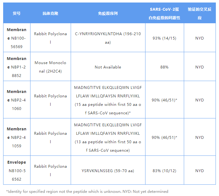 SARS-CoV-2 與 SARS-CoV 的膜蛋白具有 91% 的序列同源性,包膜蛋白具有 95% 的序列同源性。Novus Biologicals? 提供了幾種用于檢測(cè) SARS-CoV 內(nèi)膜蛋白和包膜蛋白的抗體,這些抗體可用于 WB、ICC / IF、ELISA 等多種應(yīng)用。