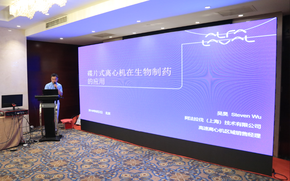 Alfa Laval公司區(qū)域銷售經(jīng)理吳昊對“蝶式離心機在生物制藥的應用”進行了主題演講