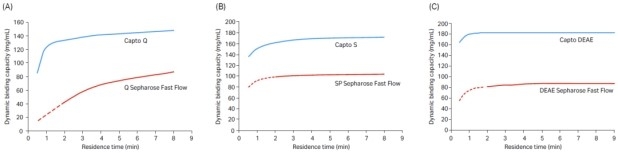 As shown in the figure above, the surface of the Capto filler has a linear dextran extension arm, which has nearly twice the dynamic load as Sepharose, and the required retention time is greatly reduced. The increased dynamic load capacity means that each Capto chromatography purification is significantly less than the amount of Sepharose filler used, and the cohhesponding solution amount is also reduced exponentially, resulting in a reduction in balancing and elution time, which will significantly improve the efficiency of the purification and separation cycle.